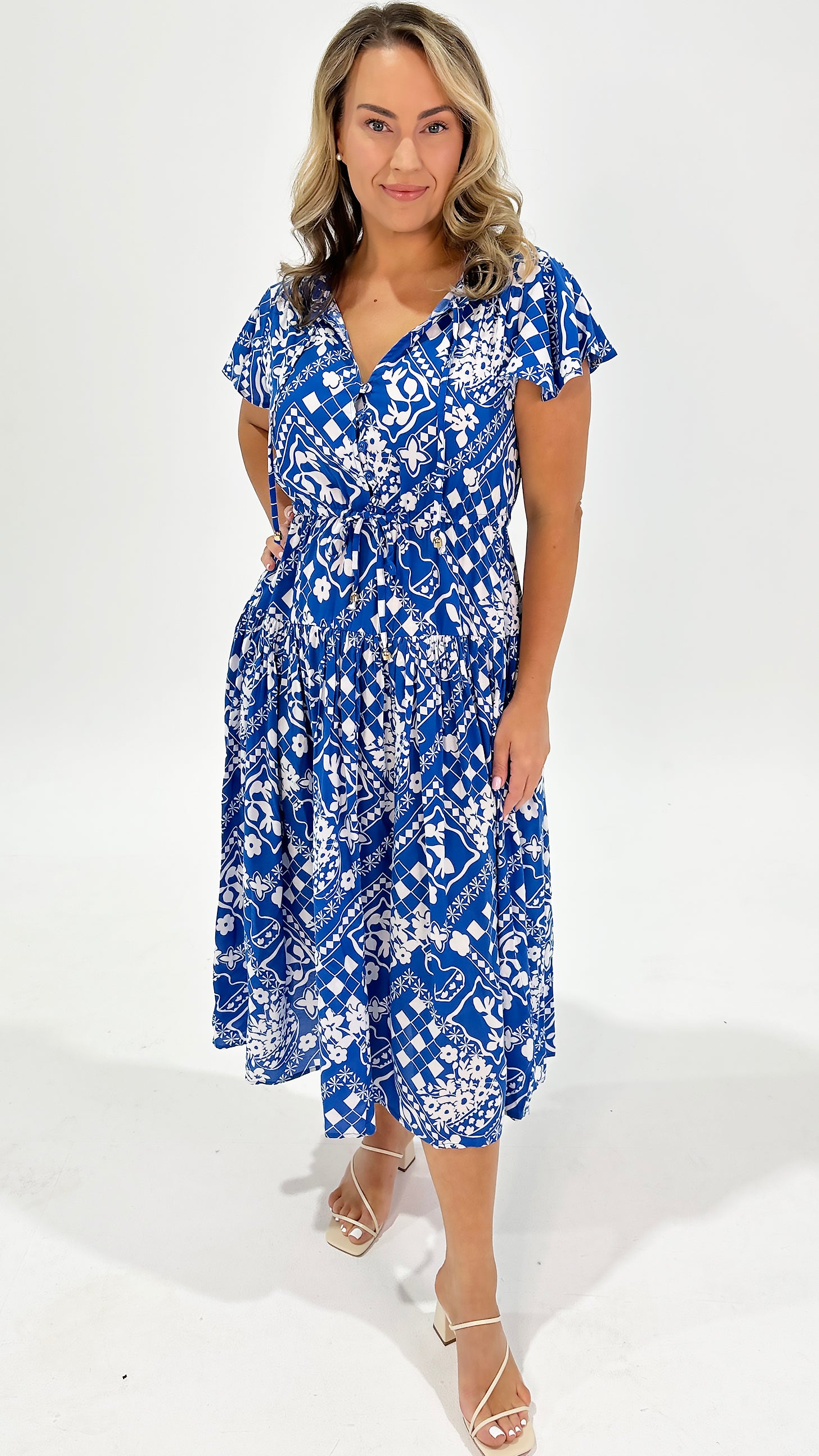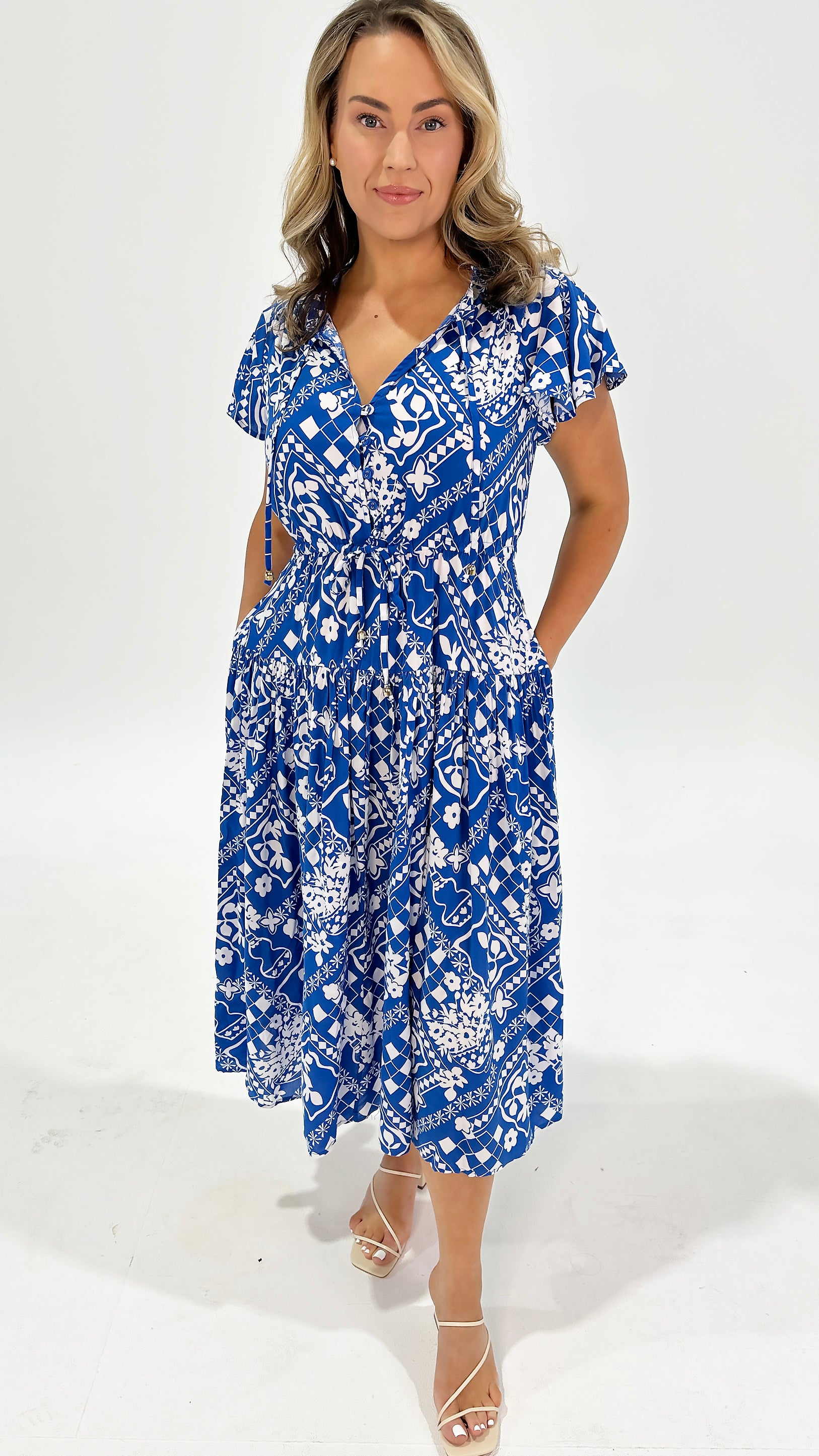 • Midi length with tiered skirt